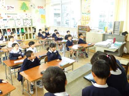 朝の時間に1年生の教室へ行き、おもちゃランドの宣伝をタブレットを使って行いました。