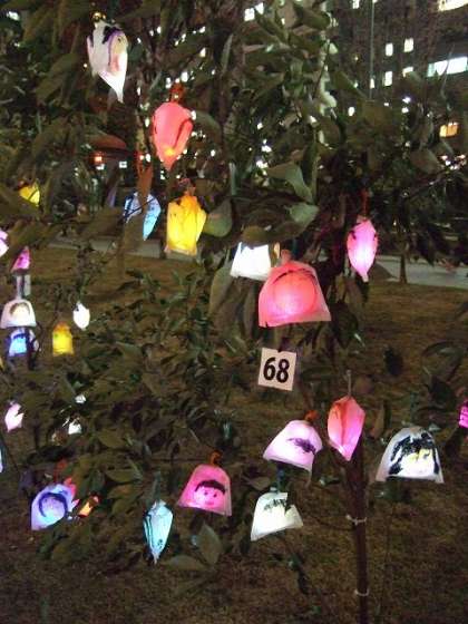 中之島公園バラ園で,子どもたちの描いた笑顔がLEDライトに照らされて木々を彩っています。豊崎小学校の子どもたちの作品は展示場所66番から69番に飾られています。