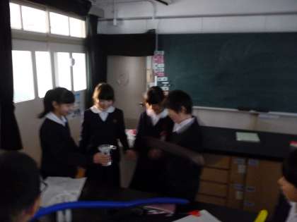 手をつなぎ輪になり静電気を集めた容器に指を近づけると。