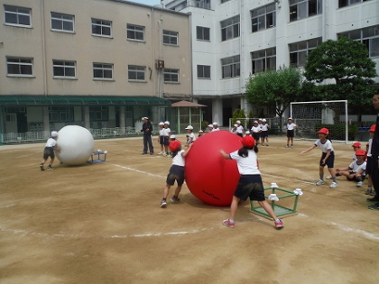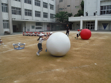 2年生は,去年の運動会でもやったことがあり,どうすればうまく転がせるかというこつを知っていますが,1年生にとってはは初めての競技です。なかなか思ったように玉が転がらず、悪戦苦闘。台の上に自分の体と同じくらいの大きさの玉を乗せるのも難しかったようです。そんな1年生に2年生は,「頑張れ!」「あと少し。」と声援を送っていました。