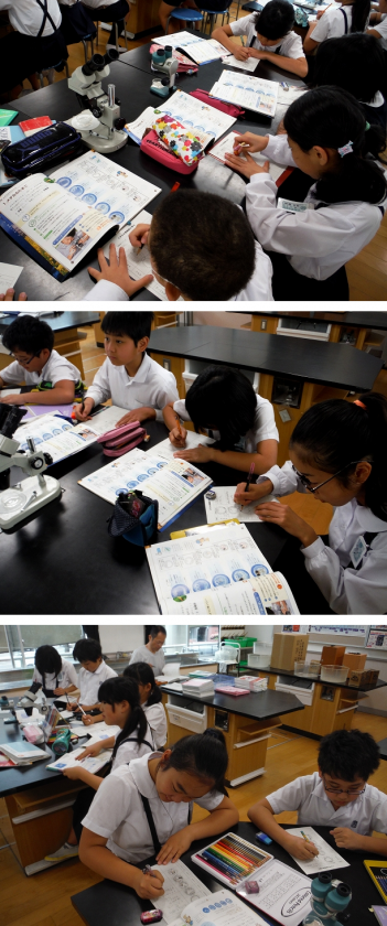教科書の写真を見ながら,メダカの受精卵が育っていくようすをプリントにまとめました。