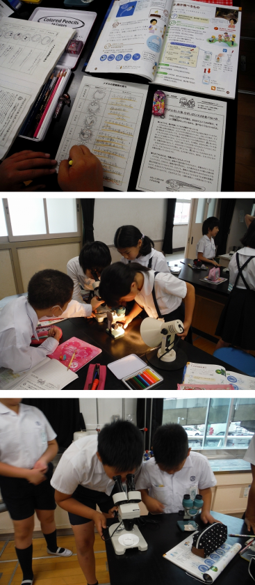 プリントにまとめた後,双眼実体顕微鏡でメダカの受精卵を観察しました。