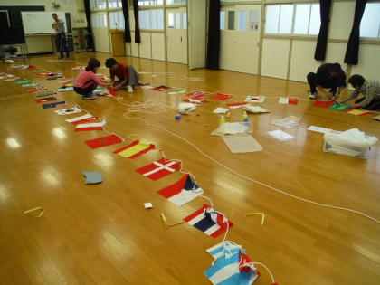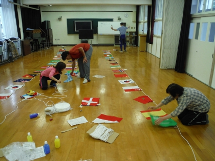 放課後,多目的室でロープに万国旗を括りつけて準備を進めました。子どもたちが演技や競技する運動場の上に,当日の朝掲げます。来週は週初めから雨模様のようですが,運動会当日は晴れるといいですね。