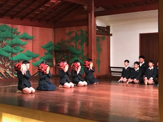 保護者の方や3年生が見守る中での晴れ舞台です。学校で練習していたのとは違い少し緊張したようでしたが、立派な能舞台の上でしっかり演じきることができました。