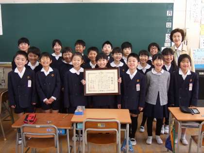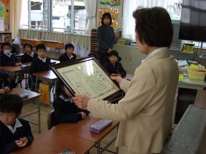 11月に、1・2年生が人権の花運動でチューリップの球根を植えましたが、人権尊重思想の普及に貢献したということで、大阪法務局から感謝状をいただきました。「これからもみんななかよくしてね」というお言葉に、1年生も2年生も「はい!」と元気よく返事をしていました。