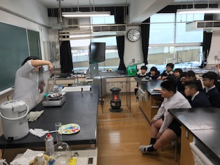 今日は大阪市立科学館の方をゲストティーチャーに迎え、たくさんの実験をしていただきました。内容は今、学習している「水のすがた」です。理科室にはない大きなフラスコやバーナーを使用して分かりやすく水と湯気、水蒸気の違いを学習することができました。科学館の皆さん、ありがとうございました。