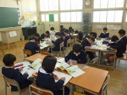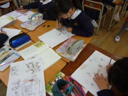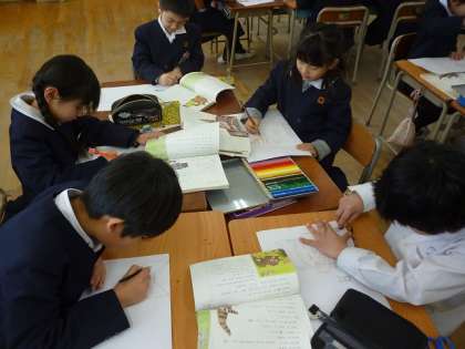 「ニャーゴ」のまとめに班で協力して紙芝居を作っています。