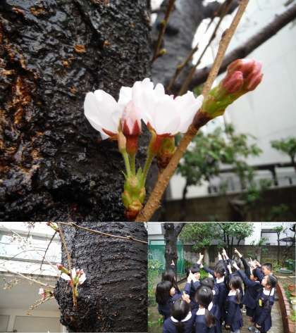 池には鯉,大きな甕(かめ)にはメダカが泳いでいます。そこの桜の木を見ると…