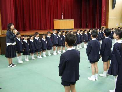 新級した学年の場所に並んで,緊張した面持ちの子どもたち。