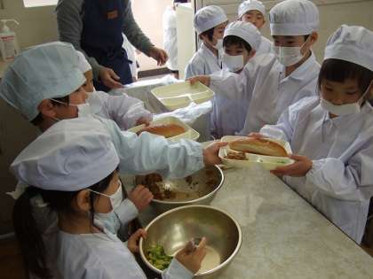 配膳も自分たちでがんばりました。慎重にていねいに入れて、配って、