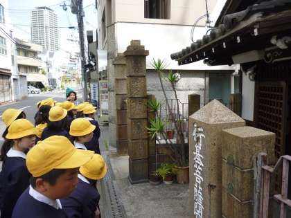 社会科の歴史学習のはじめに、豊崎の町の史跡めぐりをしました。
