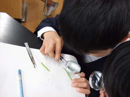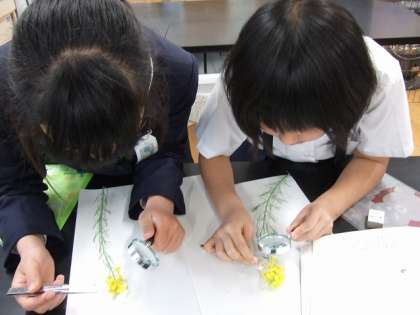校庭に咲いていたアブラナを観察しました。まず,茎や花の様子を全体的に見てスケッチし,その後ピンセットで花や実を解体しながら,細かいところを虫めがねを使って詳しく見ていきました。