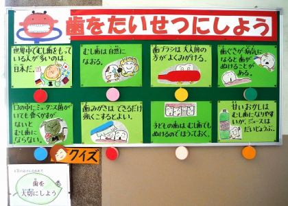 保健室前の掲示が新しくなりました。「歯をたいせつにしよう」と題した掲示です。