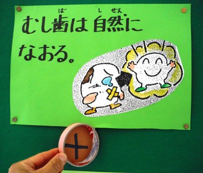 「むし歯は自然になおる。」「子どもの歯は,むし歯でもぬけるのでほうっておく。」「甘いおかしはむし歯になりやすいが,ジュースはだいじょうぶ。」など,○×クイズになっていて,紐についた丸い部分をめくると答えが書いてあります。