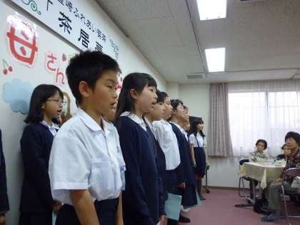 子どもたちは「今、がんばっていることは、倒立の練習です」「連休には、おばあちゃんのところに車で行きました。渋滞で大変でした」などと話し、地域の方もうなづきながら聞いてくださいました。