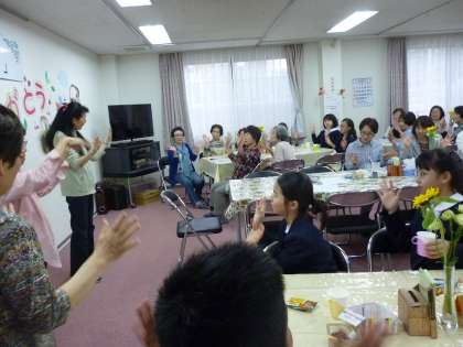 その後、手話体操を教えていただいたり、飲み物とお菓子をいただきながら地域の方とお話をしたりしました。