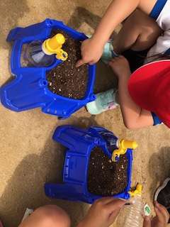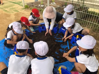 前の時間に種の色や形をよーくみて、今日は種まきをしました。