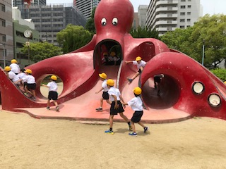 そしてその後は、お楽しみタイムでブランコやすべり台、おにごっこで遊びました。たこのすべり台が、大人気!
