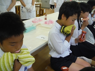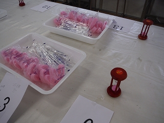 歯科衛生専門学校の方から歯みがき指導を教室で受け、その後、図工室でフッ化物塗布です。