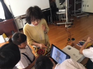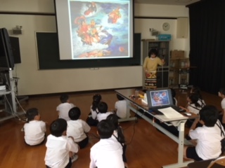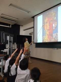 15日は梅田スカイビルの空中庭園展望台と天空美術館へ見学に行きます。今日は天空美術館見学に向けて。本校100周年記念絵本『かんこうさんがふってきて』制作で大変お世話になった内部恵子先生を講師にお迎えして事前授業を行いました。
