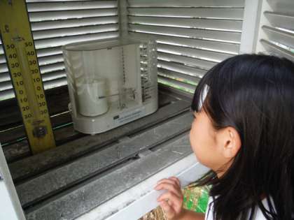 記録温度計は気温の変化を自動的に連続して記録してくれます。記録用紙をみんなで確認してから,百葉箱の中に収めました。