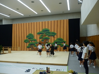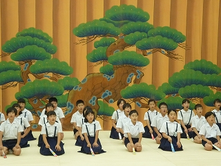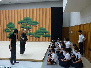 5年生がみんなの前で昨年取り組んだ能楽の謡を披露の前に、