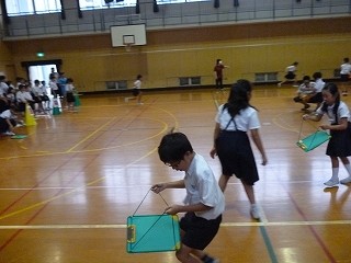 班で協力して球を落とさず運ぶリレー形式のゲームでした。