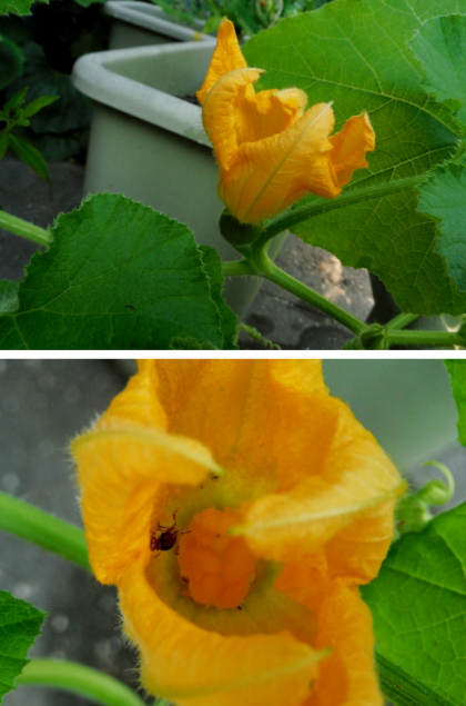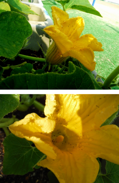 朝,カボチャを植えているプランターを確認すると,1つだけめばなが咲いていました。