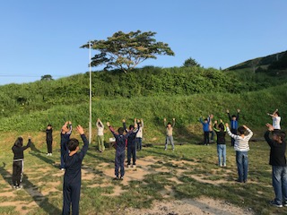 しっかりラジオ体操をして、体を起こしましょう。