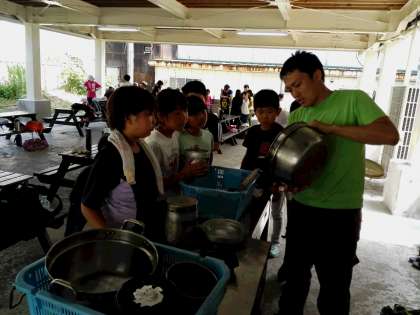 すすの汚れ、カレーの油、飯盒についたとれにくいご飯粒などをきれいに洗い落とします。きびしいチェックが入ります。