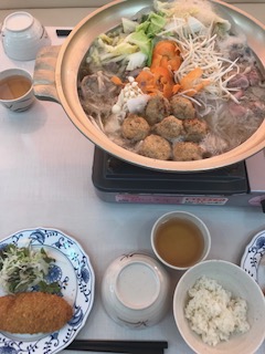 2日目の夕食は、鴨鍋と白身フライです。1つの鍋をみんなでつつき合います。これも貴重な経験ですね。