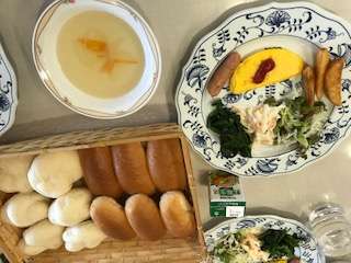 今日の朝食は洋食です。この後の活動に備えてしっかり食べましょう。
