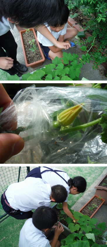 では,この実験をしてどうなるか確かめるために,プランターに植えたカボチャを見に行き,咲いていない雌花を袋をかぶせました。みんなの予想どおりになるかな?