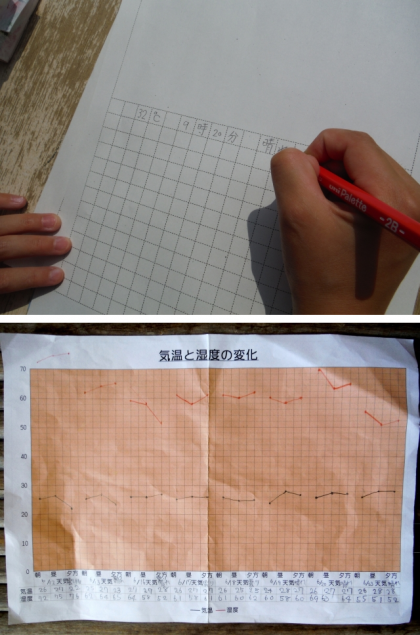 算数で折れ線グラフを習いましたが,朝・昼・夕方の気温を調べてきた子がいました。湿度も調べていますよ。なにかつかむことができたかな。印刷したものを明日みんなに配ります。
