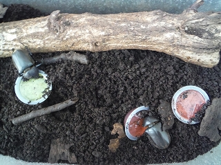 職員室前の寒暖計は午後3時を過ぎても33度。熱中症厳重警戒のランプが点滅しています。でも,カブトムシたちは食欲旺盛です。管理作業員さんによると,ケースに2〜3匹ずつ入れているカブトムシですが毎日ゼリーを2カップずつ平らげているそうです。今もカップに頭を突っ込んで猛烈な勢いで食べています。