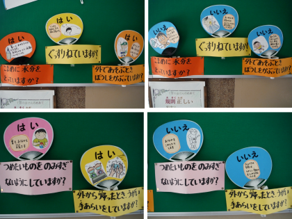 などの項目があり,団扇(うちわ)を裏返すと「はい」か「いいえ」が書いてあり,それぞれの項目について注意点が書かれてあります。