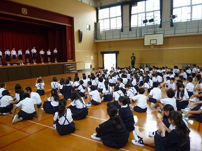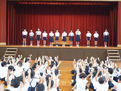 今日の児童集会は新聞・放送委員会の発表でした。朝,昼,掃除の放送を1・2・3年生の代表の児童に体験してもらったり,普段放送で流している曲のイントロ当てクイズをしたりしました。よく耳にしている曲も,最初の一部分だけだと何の曲かなかなか分からないものですね。
