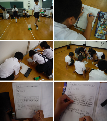 記録をノートに書いていき,風力を中・強にして実験をしていきました。