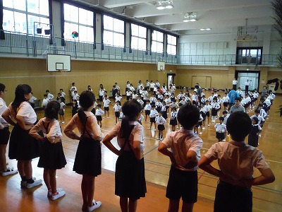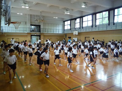 児童集会でトトロの曲にあわせて、姿勢体操をしました。