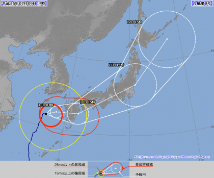 ※画像は,7月9日午後5時発表の気象庁の台風情報の台風経路図です。