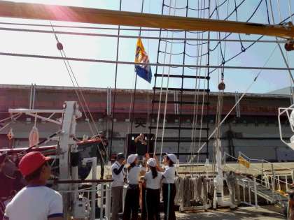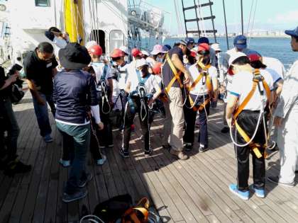 全員で作った旗を揚げた後、マストクライムの準備です。安全のためハーネスを装着します。