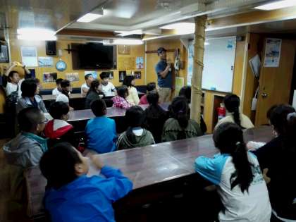 船の航海と星とは大切な関係にあります。どのようにして位置を知ることができるのかの説明をしていただきました。その後、デッキに出て星空観察です。頭上に夏の大三角形が見えました。七夕伝説を聞きました。雲が出てきて残念ながら国際宇宙ステーションは見ることができませんでした。