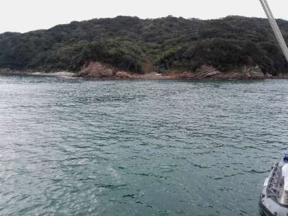 デッキウォッシュ、朝食の間に「みらいへ」は地の島に着いていました。子どもたちが部屋で準備をしている間もクルーの方々が上陸の準備をしていただいています。写真に見られる白っぽい物は漂着したゴミです。これから調査に行きます。