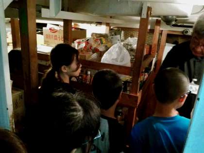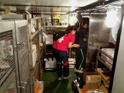 食事の片付けの時間の合間に、特別に「みらいへ」の食料倉庫を見学させていただきました。冷蔵庫から冷凍庫まで見せていただきました。マイナス20℃の世界を体験しました。ありがとうございました。