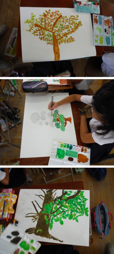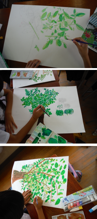 6月20日に描いた絵に,水彩絵の具で丁寧に,太陽の光を受け,風に揺れささやいている緑の葉っぱの様子を描いていきました。