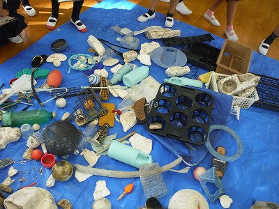 帆船「みらいへ」の乗組員の方々にお越しいただき、修学旅行で拾い集めた「海ごみ」をもとに、海の環境について学習しました。