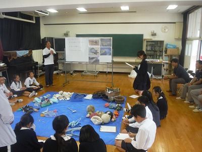 海のごみをえさと間違えて食べてしまって命を落としたクジラや、海にただようビニールごみが体にからまったまま成長し、体の形が大きくゆがんだウミガメなどの写真を見て、子どもたちの表情は一気に引き締まりました。