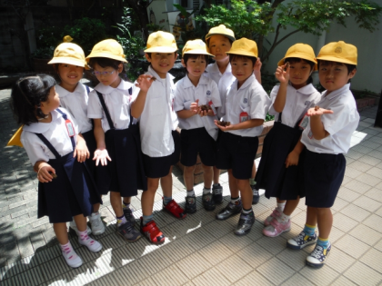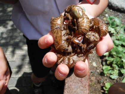 1年生の子どもたちが,手のひらいっぱいにセミの抜け殻を集めていました。