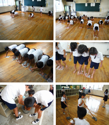 男子が手を交差させて雑巾がけを始めると,女子はなにやら二人三脚の様相。