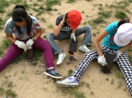 たわしでゴシゴシ…。あっ,木目が出てきた!